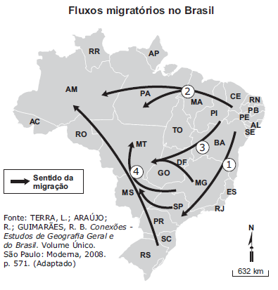 De acordo com seus conhecimentos e as informações contidas no mapa, preencha adequadamente as lacunas no texto conforme as setas presentes no mapa. As migrações representadas pela seta de número ____ apresentam os principais fluxos colonizadores das regiões Centro-Oeste e Norte na segunda metade do século XX: brasileiros do sul e sudeste, detentores de capital, terra e tecnologia e responsáveis por levar desenvolvimento econômico a estas regiões até então pouco exploradas, propiciando exploração do trabalho dos menos qualificados. As migrações representadas pela seta de número ____ correspondem aos trabalhadores rurais em busca de empregos de baixa exigência de capacitação nas fronteiras agrícolas da região Centro- Oeste a partir dos anos de 1960. As migrações representadas pela seta de número ____ correspondem ao êxodo rural dos nordestinos com baixa qualificação profissional para o sudeste brasileiro, observado entre os anos de 1950 e 1980, mas que foram responsáveis pela construção das grandes cidades nesta região. As migrações representadas pela seta de número ____ correspondem em parte à corrida pelo ouro na Serra Pelada e dos Carajás, no Estado do Pará, nos anos de 1980, atraindo milhares de garimpeiros com baixíssima instrução profissional relacionada à mineração.