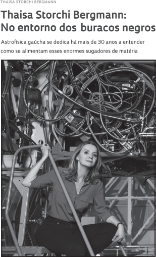 A pesquisadora Thaisa Storchi Bergmann é uma das mais respeitadas especialistas em buracos negros supermassivos. A expressão designa regiões do espaço extremamente compactas, situadas no centro da maior parte das galáxias conhecidas, onde a gravidade é tão forte que nada lhe escapa, nem a luz. Em 2010, Thaisa recebeu o Prêmio Scopus, da Editora Elsevier, e, em 2015, o Prêmio L’Oréal/Unesco para Mulheres na Ciência. Além de ser membro da Academia Brasileira de Ciências (ABC), ela também é membro da Academia Mundial de Ciências (TWAS), da Sociedade Astronômica Brasileira (SAB) e da União Astronômica Internacional (IAU).