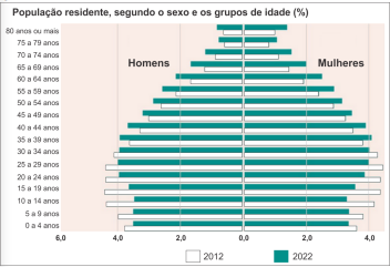 A pirâmide mostra que o envelhecimento da população brasileira aumentou entre 2012 e 2022. De acordo com o IBGE, houve redução dos percentuais de homens e mulheres em todas as faixas etárias até 34 anos.