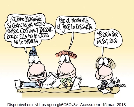 La viñη menciona a la ex presidenta argentina, Cristina Kirchner, y a su ex secretario general, Oscar Parrilli, reproduciendo un telediario. El comentario entre comillas en el último globo es chistoso, porque se basa en la presuposición de que