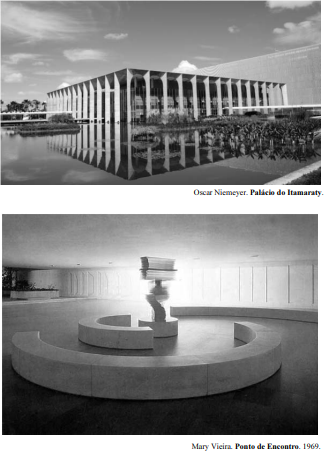 Tendo como referência inicial o texto anterior e as imagens apresentadas, correspondentes ao Palácio do Itamaraty e à obra Ponto de Encontro, de Mary Vieira, julgue o item a seguir.