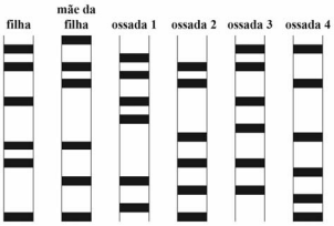 A figura a seguir representa simplificadamente uma análise de DNA baseada em seis marcadores genéticos (representados pelos traços escuros) relativos, respectivamente, à filha de um desaparecido político, à mãe biológica dela e a quatro ossadas distintas.