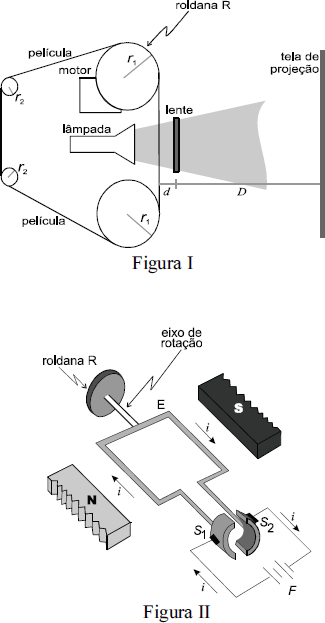 O motor do projetor cinematográfico pode ser representado, simplificadamente, pelo diagrama da figura II, em que é mostrada a espira E conduzindo a corrente i. Essa espira é alimentada pela bateria F, que, por sua vez, é ligada às escovas S1 e S2, que fazem contato elétrico com duas peças de formato cilíndrico que estão rigidamente atreladas à espira. A espira, que se encontra no entreferro de um ímã, está livre para girar ao redor do eixo que passa pelo centro da roldana R, de raio r1, conforme mostrado nas figuras I e II.
