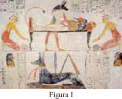 Com o processo de mumificação, ilustrado na figura I acima, visava-se preservar os corpos após a morte. Primeiramente, eram retiradas as vísceras e o cérebro, que se decompunham mais facilmente. Em seguida, o corpo era colocado, por cerca de 40 dias, em um recipiente com natrão, para ser desidratado, o que impedia a ação das enzimas e a existência de bactérias. Após ser desidratado, o corpo era lavado com água do rio Nilo e preenchido, por exemplo, com serragem, sendo aplicados sobre ele não só essências aromáticas, mas também camadas de resinas e óleos de plantas, cuja ação bactericida e antisséptica evitava a ação de micro-organismos. Finalmente, o corpo era envolvido em faixas de linho branco e colocado em um sarcófago. O natrão, primeiro recurso utilizado nesse processo, é um minério constituído por sais de sódio, principalmente carbonato. Pesquisas recentes revelam que, além de atuar como desidratante, o natrão catalisa a transformação de gorduras do corpo em sais de ácidos graxos e glicerol, os quais são solúveis em água, e, portanto, no processo utilizado pelos egípcios, supostamente, eram dissolvidos quando o corpo era lavado. Essa perda de gordura contribuía para a forma encolhida da múmia e também removia uma fonte de energia vital para bactérias, o que favorecia a preservação de corpos.