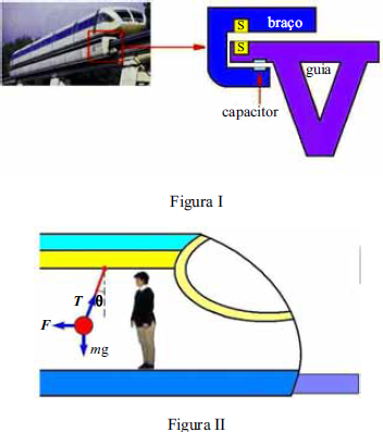 Um dos meios de transporte de passageiros mais eficiente e moderno é o trem Maglev, que utiliza interações magnéticas para levitar e mover os vagões. O vagão é montado sobre um trilho localizado na parte inferior do veículo, que abriga os ímãs para a levitação e os ímãs-guia. A porção inferior do trem envolve a deslizadeira, e os sistemas que controlam os ímãs asseguram que o veículo permaneça próximo dela, mas sem tocá-la. A principal fonte de resistência para um veículo Maglev é o ar, problema que pode ser amenizado por ajustes aerodinâmicos. Os inovadores sistemas de guias e de propulsão eliminam a necessidade de rodas, freios, motores e dispositivos para captar, converter e transmitir a energia elétrica. O processo de levitação esquematizado na figura I mostra a guia e o braço de acoplamento ao trem, que contém dois magnetos de mesma polaridade (S), além de duas placas de um capacitor. O capacitor é usado para se saber a que altura o trem está da guia. A figura II representa um passageiro que, em pé em um vagão do Maglev, observa um pêndulo de massa m = 0,5 kg preso ao teto do vagão por meio de uma haste de massa desprezível, a qual faz um ângulo θ com a vertical.