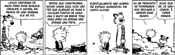 O fragmento de texto acima alude à morte de determinados modelos de desenvolvimento e à necessidade de novos parâmetros para o desenvolvimento socioeconômico. Em relação aos temas evocados na tira e no texto acima, julgue o item a seguir.