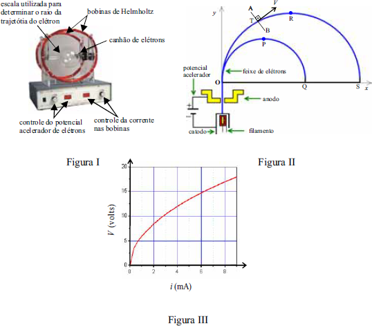 A figura I acima mostra um aparelho utilizado para se determinar a razão carga/massa (e/m) do elétron. Nesse equipamento, um feixe de elétrons produzido por um canhão de elétrons é injetado em uma região de campo magnético criado por um par de bobinas. Dependendo da velocidade dos elétrons e da intensidade do campo magnético, os elétrons podem realizar um movimento circular entre as bobinas. Essa situação é ilustrada esquematicamente na figura II, que mostra a estrutura do canhão acelerador de elétrons e duas trajetórias diferentes obtidas em condições distintas do aparelho, em um sistema de coordenadas cartesianas xOy. No canhão de elétrons, um filamento incandescente aquece uma placa metálica no catodo, para liberar elétrons de sua superfície. Esses elétrons são, então, acelerados em direção ao anodo por um potencial acelerador. Ao chegarem ao anodo, eles passam por uma abertura e são ejetados do canhão para dentro da região de campo magnético, onde o feixe se curva. O gráfico da figura III mostra a relação entre a diferença de potencial e a corrente elétrica do filamento do canhão. Na figura II, os pontos P = (5, 5), Q = (10, 0), R =