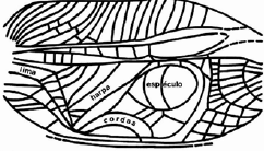 Os grilos machos são responsáveis por aquele canto interminável e quase uniforme que interrompe o silêncio noturno e é componente sonoro indispensável nesse ambiente. Não se trata, na verdade, de um canto, mas, da execução de um “instrumento” localizado nas suas asas anteriores. Eles friccionam essas asas, uma sobre a outra, em um movimento ultrarrápido, produzindo os sons característicos, um silvo ora alto e estridente, ora muito suave, com o objetivo de cortejarem a fêmea. Essa musicalidade deve-se a um arranjo especial das veias das asas anteriores dos grilos machos. Esse arranjo das veias, que formam numerosos sulcos, é semelhante a um reco-reco, denominado lima. Os seus prolongamentos recebem o nome de cordas e, acima destas, as veias encerram um espaço chamado espéculo. Entre a lima, as cordas e o espéculo, existe um espaço relativamente triangular, que, por ser semelhante a uma harpa, é designado por esse termo. Todos esses elementos estão identificados na figura acima. Com o atrito das asas, a lima gera as ondas, as cordas vibram, a harpa propaga o som emitido e o espéculo atua como amplificador.