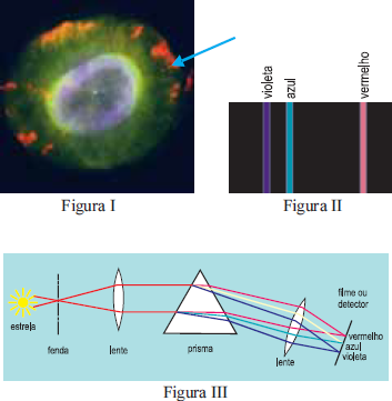 No fenômeno da fluorescência, um átomo absorve energia e a reemite na forma de radiação eletromagnética, composta de uma coleção de comprimentos de onda característicos, sendo parte deles compreendida na região do visível, conforme ilustra a figura II, que exemplifica o caso do átomo de hidrogênio. No estudo desse fenômeno, para se identificar a presença de cada elemento químico nas estrelas e nebulosas, usam-se cores, que podem ser determinadas por meio de um espectroscópio, cujo esquema básico é mostrado na figura III.