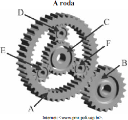 Considere que as rodas dentadas que formam a engrenagem ilustrada na figura acima estejam colocadas em eixos, que a roda A tenha 44 dentes tanto na parte externa quanto na parte interna, que as rodas B e C tenham 22 dentes cada uma e que o número de dentes de cada uma das rodas D, E e F seja igual a 11. A partir dessas informações, julgue: