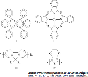 Será provavelmente dispensável, em uma viagem no futuro, acomodar o notebook em uma pasta ou mochila. Bastará dobrá-lo e enfiá-lo no bolso. Esse avanço tecnológico será realidade quando as telas flexíveis de diodos orgânicos emissores de luz, com base no fenômeno da eletroluminescência, chegarem ao mercado. Pesquisadores brasileiros desenvolveram um diodo orgânico em que é utilizado um substrato à base de biocelulose, uma espécie de papel com transparência superior a 90% na região visível do espectro eletromagnético. As vantagens desse substrato, além da flexibilidade, estão relacionadas com o fator ambiental, com o sistema produtivo mais simples e com o uso de matéria-prima renovável. Também chamada de celulose bacteriana, essa matéria-prima é produzida pela bactéria Gluconacetobacter xylinus, e seu processo produtivo não gera resíduos tóxicos, como ocorre no método tradicional de produção de celulose. Embora possua a mesma estrutura química da celulose de plantas, a biocelulose apresenta, em comparação com a sua congênere vegetal, maior pureza, alta cristalinidade e excepcional resistência mecânica. A luminescência e a eletroluminescência ocorrem em estruturas conjugadas que têm sistema de elétrons deslocalizados, como as mostradas nas figuras de I a IV.