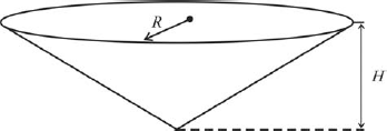 Considere que, pelo movimento de rotação, durante sua formação, a placa de lixo gigante tenha o formato de um cone reto, de altura H e raio da base R, como ilustra a figura a seguir, na qual a superfície do sétimo continente corresponde à base do cone, a qual está virada para cima.