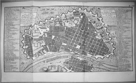 Lima, capital de Perú y ciudad más grande y poblada del país. Su plano ortogonal se creó después de la colonización española. Este es el mapa de Lima en 1750.
