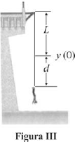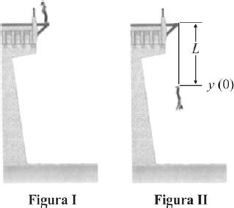 Assuma que a força elástica na corda é uma função linear do estiramento ou distensão Δy, que o termo independente é igual a zero, e a constante elástica da corda é k = !180 N/m. Considere que a função y(t) = L + d \sen(2πt/T), em que T é o período de oscilação, descreve a posição do jovem durante o salto, a partir da referência t = 0, quando ele se encontra na posição mostrada na figura II. Considere, ainda, t dado em segundos, a aceleração da gravidade g = 10 m/s2 e π = 3,14.