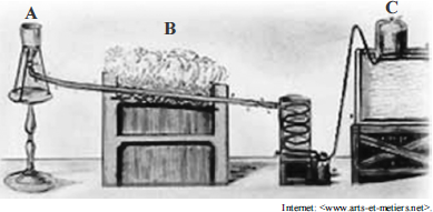 Em seu experimento, ele colocou em um recipiente (A) uma massa conhecida de água destilada e a fez passar sobre ferro incandescente (B), promovendo a decomposição da água e a obtenção de gás H2, que foi coletado em um recipiente indeformável (C). A seguinte equação química não balanceada retrata essa reação.
