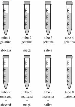 Em determinada prática escolar, estudantes prepararam quatro tubos com gelatina derretida, que é um alimento rico em colágeno (proteína). Ao conteúdo do tubo 1 adicionaram fatias de abacaxi; ao do tubo 2, fatias de maçã; ao do tubo 3, saliva humana; e nada foi adicionado ao conteúdo do tubo 4, além da gelatina derretida. Dentro de outros quatro tubos foram colocados 10 mL de maisena (amido de milho) dissolvida em água. Ao conteúdo do tubo 5 os estudantes adicionaram fatias de abacaxi; ao do tubo 6, pedaços de maçã; ao do tubo 7, saliva humana; e nada adicionaram ao conteúdo do tubo 8, além da maisena dissolvida em água.