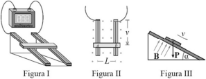 As figuras a seguir ilustram uma aplicação da Lei de Faraday. Na figura I, duas barras metálicas paralelas, inclinadas a um ângulo α com relação à horizontal, são interligadas por uma terceira barra, que pode se mover perpendicular a elas. Tais barras estão sob o efeito de um campo magnético B, como mostram as figuras II e III, que são as projeções superior e lateral da figura I. Na figura II, os terminais indicados por a e b estão separados por uma distância L e, na figura III, que explicita a ação de um campo magnético
