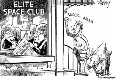The cartoon showed a farmer with a cow knocking at the door of a room marked Elite Space Club where two men sit reading a newspaper on India's feat.