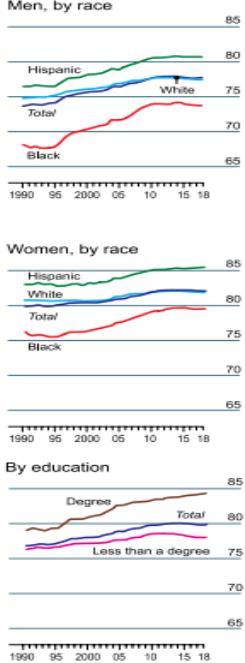 (Anne Case and Angus Deaton. “Life expectancy ∈ adulthood is falting for those without a BA degree, but as educational gaps have widened, racial gaps have narrowed”. PNAS« 2021. Adaptado.)