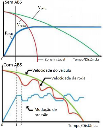 O freio ABS (do inglês “Anti-lock Braking System”) é um sistema de frenagem antitravamento das rodas de um veículo quando o pedal de freio é acionado fortemente, evitando que ele entre em derrapagem. Os gráficos a seguir apresentam, respectivamente, a curva de frenagem de um veículo com e sem o sistema ABS.