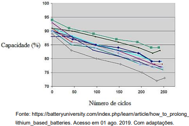 Parte significativa dos equipamentos eletrônicos atuais utilizam baterias recarregáveis. Os smartphones, por exemplo, estão neste grupo de equipamentos e precisam vencer o desafio de suportar centenas de ciclos de carga e descarga e ainda assim manter sua eficiência em converter energia química em energia elétrica – e vice-versa – próxima a 100%. A figura que se segue mostra a relação entre o número destes ciclos e a respectiva percentagem de conversão de energia que bateria de íons de lítio (Li-íon) consegue alcançar. Note que após 250 ciclos de carga e descarga uma bateria Li-íon tem sua capacidade de conversão reduzida a cerca de 73%.