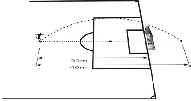 Um jogador de futebol chuta uma bola a 30 m do gol adversário. A bola descreve uma trajetória parabólica, passa por cima da trave e cai a uma distância de 40 m de sua posição original.