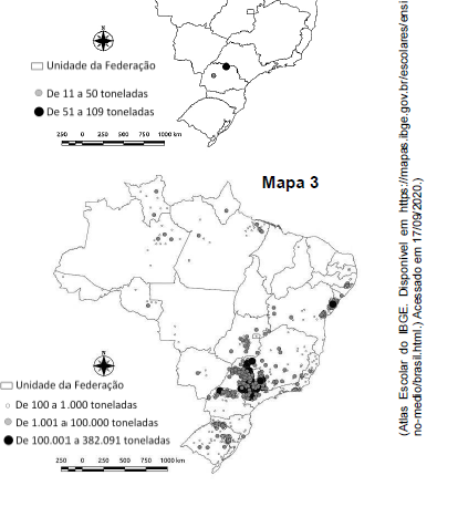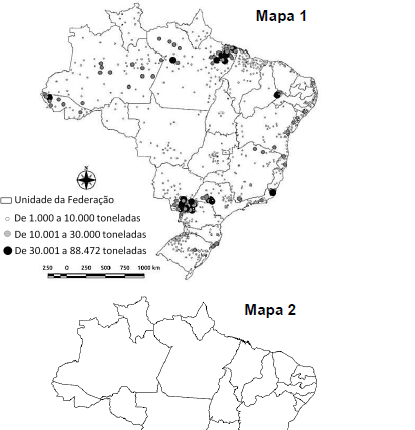Analise os mapas, que mostram a área plantada (em hectare) da produção de cana-d