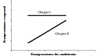 Raposas do ártico, ursos polares, focas e pinguins são capazes de manter sua temperatura corporal elevada nos polos, enquanto os ratos do deserto, as iguanas e as cascavéis sobrevivem no Vale da Morte, onde as temperaturas diurnas no verão chegam a 50 °C à sombra. A esse respeito, analise o gráfico abaixo que se refere à relação entre a temperatura corporal de dois grupos de animais e a temperatura ambiente.