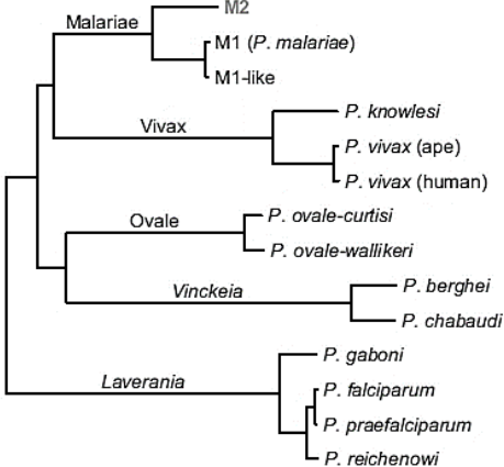 M2-representa uma nova linhagem de P. malariae que infecta macacos na África. M1 e M1-like- representam espécies de P. malariae e seu parente próximo encontrados em macacos africanos.