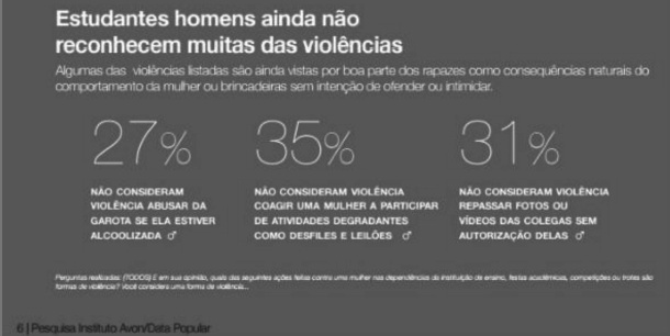De acordo com os últimos relatórios publicados pelo Ipea (renomado instituto de pesquisa brasileiro), é alarmante o aumento do feminicidio no país (mortes de mulheres por questões de gênero). A violência contra a mulher ocorre por meio de estupros, cárcere privado, tráfico de mulheres, violência sexual, afetiva, doméstica e patrimonial, desqualificação intelectual, entre outras. Desse universo, o Mapa da Violência de 2016 (último relatório sobre a temática) elaborado pela Faculdade Latino-Americana de Ciências Sociais (Flacso) publicou que em 2013 o indice de mortes de mulheres negras aumentou para 54,2%. Sobre a temática da violência contra mulheres, o Instituto Avon realizou uma pesquisa entre inúmeras Universidades públicas do pais cujos dados revelaram que no ambiente universitário: “56% das estudantes já sofreram assédio sexual, 28% sofreram violência sexual e 11% sofreram tentativa de abuso sob efeito de álcool” (Instituto Avon/Data Folha, 2014). Os dados revelaram ainda: