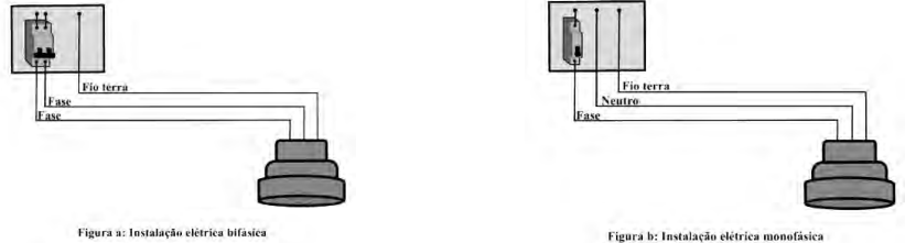 Em todos os manuais de instalação de chuveiros elétricos, vem escrito que, antes da instalação, o disjuntor do circuito ao qual o chuveiro será instalado deve ser desligado. Esse cuidado deve ser tomado para evitar acidentes, pois as consequências de um choque elétrico podem ser graves, principalmente quando a pele do corpo humano está molhada e sua resistência elétrica se reduz à ordem de 1.000 Ω. Considerando uma situação em que, com o disjuntor acionado, uma pessoa com o corpo molhado, acidentalmente, encosta as mãos nos fios de instalação do chuveiro e analisando que o disjuntor está ligado aos fios do chuveiro em uma instalação elétrica bifásica (figura a) e em uma monofásica (figura b), atribua V (verdadeiro) ou F (falso) às afirmativas a seguir.