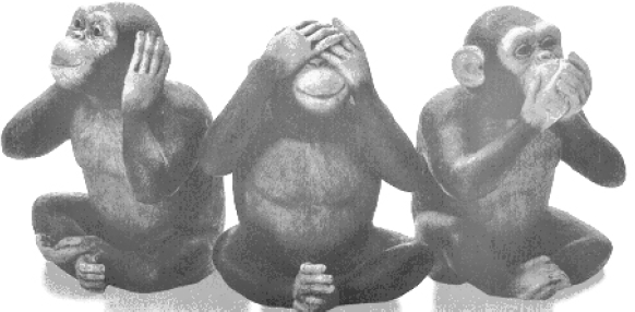 [10] pelos três macacos da sabedoria. Cada um cobre uma parte diferente do rosto com as mãos. O primeiro