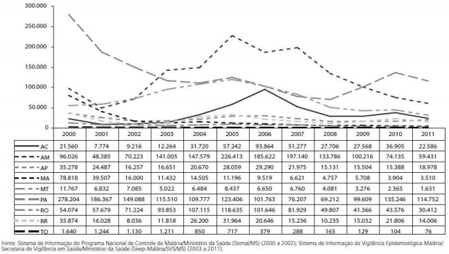 II. No ano de 2011, 98,0% dos casos estavam concentrados em seis estados: Pará, Amazonas, Rondônia, Acre, Amapá e Roraima.