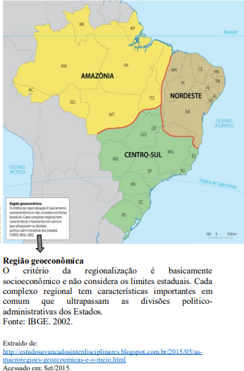 Uma proposta de regionalização do território brasileiro – não oficial, todavia com grande relevância para a compreensão do espaço geográfico nacional – difundiu-se entre os pesquisadores e na mídia em geral. Trata-se da divisão do Brasil em três complexos regionais ou regiões geoeconômicas, que obedece a critérios ligados aos aspectos naturais e ao processo de formação sócio espacial de nosso território.