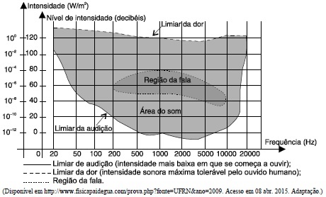 A intensidade de uma onda sonora, em W/m2, é uma grandeza objetiva que pode ser medida com instrumentos acústicos sem fazer uso da audição humana. O ouvido humano, entretanto, recebe a informação sonora de forma subjetiva, dependendo das condições auditivas de cada pessoa. Fato já estabelecido é que, fora de certo intervalo de frequência, o ouvido não é capaz de registrar a sensação sonora. E, mesmo dentro desse intervalo, é necessário um valor mínimo de intensidade da onda para acionar os processos fisiológicos responsáveis pela audição. Face à natureza do processo auditivo humano, usa-se uma grandeza mais apropriada para descrever a sensação auditiva. Essa grandeza é conhecida como nível de intensidade do som (medida em decibel). O gráfico a seguir mostra a faixa de audibilidade média do ouvido humano, relacionando a intensidade e o nível de intensidade com a frequência do som.