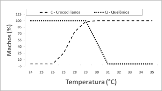 2. Temperaturas entre 31 °C e 35 °C não permitem estabelecer uma proporção de machos e de fêmeas tanto para crocodilianos como para quelônios, pois esse intervalo de temperatura é letal para os embriões no interior dos ovos.