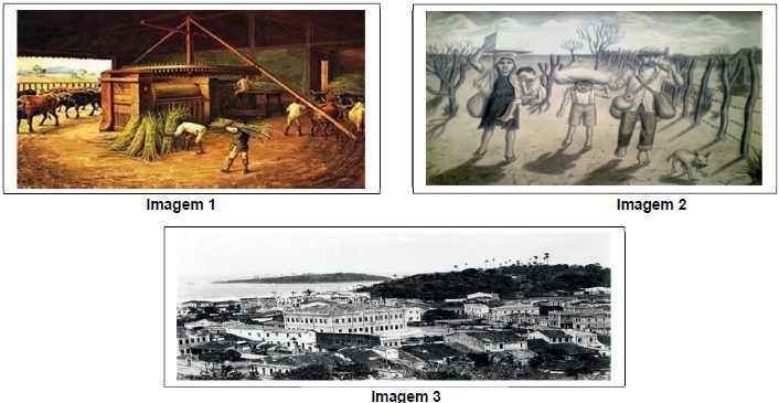 I. As três imagens referem-se, de modo simultâneo, às obras dos romancistas de trinta, José Lins do Rego, Graciliano Ramos e Jorge Amado, pois a produção artística desses autores relata acontecimentos que ocorrem nos três espaços representados nas imagens expostas.