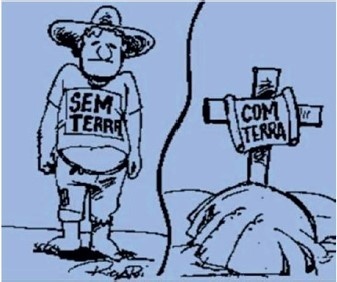 ( ) A charge apresenta, tanto quanto o fragmento do texto de João Cabral, uma crítica à condição do lavrador, que, durante toda vida, trabalha a terra, mas só tem direito a ela quando morre. Na imagem, o lavrador vivo traz a placa SEM TERRA, enquanto no poema, tal qual na charge, só adquire o direito à terra após a morte, que representa “a terra que queria ver dividida.”