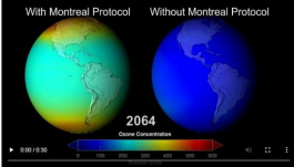 En vídeo, la comparación de la concentración de ozono en la atmósfera con ysin el protocolo de Montreal.NASA