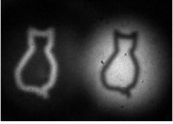 Por meio da nova técnica, os pesquisadores registraram imagens de um gato recortado em um pedaço de cartolina e outro gravado em uma placa de silício, em referência ao ‘gato de Schrödinger’, analogia criada para explicar a natureza quântica da matéria. (imagem: Gabriela Barreto Lemos)