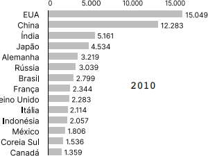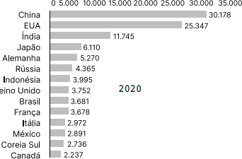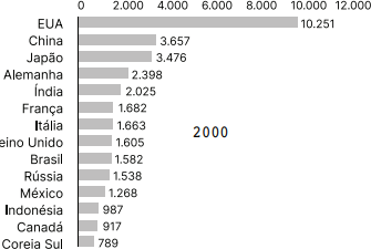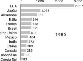 As 14 maiores economias do mundo em US$ correntes: 1980, 2000, 2010, 2020